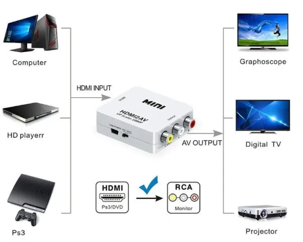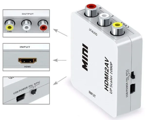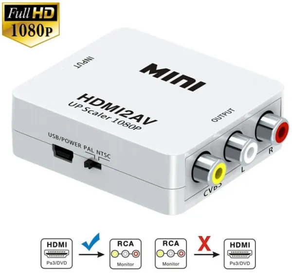 HDMI2AV The HDMI to CVBS AV Composite RCA Video Audio Converter Adapter 1080P HDMI2AV which will convert HDM video signal or audio signal to AV(CVBS)composite video signal and the FL/FR stereo audio signals, while support DVI system sideline signals.To help users convert the high quality of the HDMI video signal into normal CVBS signal(standard-definition 480i,576i).So that can play on TV,VHS VCR,DVD recorders,etc and support NTSC and PAL two TV format. Features: No need to install drivers, portable,flexible,plug and play Low power, no need power supply Output the audio synchronization with video High bandwidth capability support 1920x1080 -60Hz Compatible HDMI 1.3/1.2/1.1. Input ports: HDMI type female Output ports: AV RCA Application Example: HD camera, HD DVD, Displayer, Earphone, Projection. Specifications: * Output ports: 1x RCA (Yellow,White,Red). * Input ports: 1x HDMI. Resolution Support: 640x480 60Hz,800x600 60Hz,1024x768 60Hz,1280x720 60Hz,1280x1024 60Hz, 1360x768 60Hz,1600x1200 60Hz,1920x1080 60Hz.180i/60Hz,480p/60Hz,576i/60Hz,576p/60Hz,720p50/60Hz,1080I50/60Hz,1080p/60Hz. * CVBS output:PAL,NTSC,and NTSC