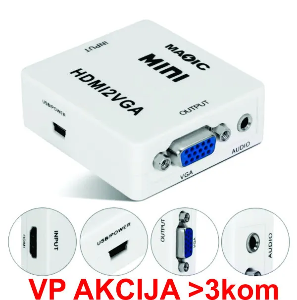 HDMI2VGA The Mini HDMI to VGA is a high-definition video converter which converts HDMI digital signal to VGA analog signal and analog audio signal. HDMI signals connection For PS3 For XBOX360, Blue-ray DVD, HD set-top boxes, CRT/LED Display etc. You can easilywatch HD Video on the normal TV without HDMI Interface. Features: No need to install drivers, portable, flexible, plug and play Low power, No need Power Supply Output the audio synchronization with video High bandwidth capability support 1920x1080@60Hz Specifications: Input Port: HDMI A Female Output Port: VGA Female and 3.5mm Jack Dimensions(mm): 66(D)x55(W)x20(H) Weight:80g Color:white
