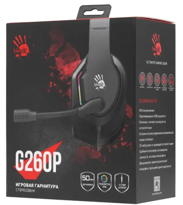 A4Tech Bloody gejmerske slusalice sa mikrofonom, A4 TECH A4-G260P BLACK 50mm/16ohm, USB za RGB, 3,5mm