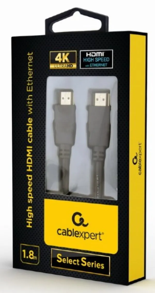 HDMI kabl velike brzine sa Ethernetom, "Select Series", 1,8 m High Speed HDMI Podržava 4K UHD rezoluciju Ethernet kanal -HDMI kabl velike brzine sa Ethernetom -Podržava 4K UHD rezolucije na 60 Hz -Pozlac´eni konektori za savršen kvalitet slike -Kompatibilan sa svim uređajima koji podržavaju HDMI Tip: HDMI velike brzine sa Ethernetom Podržane HDMI verzije: HDMI 2.0 (i sve prethodne verzije) Konektor 1: HDMI tip-A muški, ravan, pozlacen Konektor 2: HDMI tip-A muški, ravan, pozlac´en Materijal provodnika: CCA Maksimalni propusni opseg: 18 Gbps Maksimalna podržana rezolucija: 4K @ 60Hz Podržane funkcije: CEC, HEC, HARC, HDR, EDID, 3D 21:9 bioskopski odnos širine i visine: podržano ICbCr 4:2:2/4:4:4/4:2:0: podržano Duboka boja: podržano (do 16 bita po kanalu) Audio podrška: PCM, DTS-HD Master i Dolbi Digital True HD Surround Sound kompatibilan Podrška za audio kanale: 32 kanala HDCP podrška: verzija 1.4 / 2.2 Pletenje jakne: n.a. Spoljni prečnik jakne: 6 mm Stil konektora: oblikovan Dužina: 1,8 m