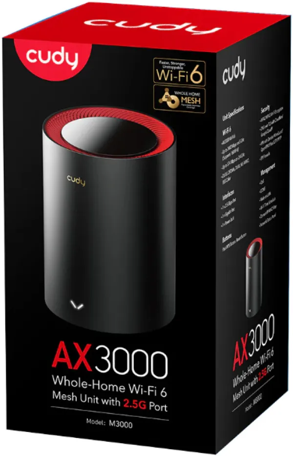 Mrežni WiFi 6 sistem sa pet antena za obezbeđivanje superbrze mreže za velike domove sa 4K strimingom i zahtevima za igranje, sa Cudy Mesh, kontrolom aplikacija, VPN, HE160, OFDMA i MU-MIMO. Pogodno za pristup internetu do 2,5 Gbps. 1,3 GHz Dual-Core CPU Dvopojasni Wi-Fi sa 5 tokova 6 200 povezanih uređaja Fast Roaming WireGuard, OpenVPN, ZeroTier, itd Verzija modela: M3000 1.0 CPU: čipset MT7981BA; Detalji CPU-a 1,3 GHz Dual-Core, ARM Cortek-A53 Memorija/Stroage Flash/ROM 128 MB (1 Gbit) NAND; DDR/RAM 256 MB (2 Gbit) DDR3 Bežični 5 GHz Wi-Fi brzina 2402 Mbps 2,4 GHz Wi-Fi brzina 574 Mbps 5 GHz Wi-Fi strimovi 3T3R (3×3 MIMO) 2,4 GHz Wi-Fi strimovi 2T2R (2×2 MIMO) Wi-Fi opsezi EU + DFS, US + DFS Wi-Fi antene 5× Unutrašnje Maksimalno pojačanje antene od 5 GHz 5,1 dBi Maksimalno pojačanje antene od 2,4 GHz 4,2 dBi FEM ili PA/LNA 5 GHz: 3× Interni; 2,4 GHz: 2× Interni Maksimalne performanse dometa: 130 m (427 stopa) Unutarnji WiFi opseg varira u zavisnosti od rasporeda i materijala zidova. Pogledajte specifikacije performansi zida za predloge za postavljanje. Performanse zida: Tri drvena zida debljine < 3,8 cm (1,5''); Jedan betonski zid debljine < 20 cm (7'') ili dva betonska zida debljine < 10 cm (4'') Snaga Wi-Fi prenosa CE: <20 dBm (2,4 GHz) <23 dBm (5,15 GHz ~ 5,35 GHz) <30 dBm (5,47 GHz ~ 5,725 GHz) FCC: <24 dBm (5,25 GHz ~ 5,35 GHz i 5,47 GHz ~ 5,725 GHz) <30 dBm (2,4 GHz i 5,15 GHz ~ 5,25 GHz i 5,725 GHz ~ 5,825 GHz) Interfejsi 2.5G RJ45 portovi 1 Gigabitni RJ45 portovi 1 Eternet napomene 2.5G port je WAN port, a gigabitni port LAN port LED: Sistem; Brzina/Link/ACT svakog Ethernet porta Fizička dugmad: WPS dugme; Reset dugme Ulaz za napajanje: DC Jack Snaga Power Methods: DC DC: 12V 1A Adapter za napajanje: Ulaz-100 ~ 240 V, 50/60 Hz AC; Izlaz- 12V 1A DC Pouzdanost Okruženje Radna temperatura: 0 C ~ 40 C (32 F ~ 104 F) Temperatura skladištenja: -40 C ~ 70 C (-40 F ~ 158 F) Vlažnost: 10% ~ 90% bez kondenzacije Vlažnost skladištenja: 5% ~ 95% bez kondenzacije Mehanička instalacija Desktop, Montaža na zid Dimenzija ?110×154,5 mm; ?4,33×6,08 inča Težina proizvoda 1-Pack | EU / SAD: 360 g (12,7 oz.) 3-Pack | EU / SAD: 360 g (12,7 oz.) 2-Pack | EU / SAD: 360 g (12,7 oz.) Sadržaj paketa: Glavni proizvod; Adapter za napajanje; Eternet kabal; Uputstvo za instalaciju Informacije o porudžbini Težina maloprodajnog pakovanja: 1-Pack | EU / SAD: 680 g (12,7 oz.) 3-Pack | EU / SAD: 1500 g (12,7 oz.) 2-Pack | EU / SAD: 1100 g (12,7 oz.) Dimenzija maloprodajnog paketa: 1-pakovanje: 145×130×265 mm 5,71×5,12×10,43 inča 2 paket: 330×130×265 mm 12,99×5,12×10,43 inča 3-pakovanje: 415×140×248 mm 16,34×5,51×9,76 inča Jedinice po kartonu 1-pakovanje: 16 2-Pakovanje: 8 3-Pakovanje: 4 Carton Dimension 1 pakovanje: 57×56×26 cm; 2,24×2,2×1,02 inča Pakovanje od 2 komada: 55×54,5×35,3 cm; 2,17×2,15×1,39 inča Pakovanje od 3 komada: 53,6×40×28,7 cm; 2,11×1,57×1,13 inča Bruto težina kartona 1-Pack | EU / SAD: 12,2 kg (26,9 lbs) 3-Pack | EU / SAD: 9,6 kg (21,16 lbs) 2-Pack | EU / SAD: 12 kg (26,46 lbs) Neto težina kartona 1-Pack | EU / SAD: 10,9 kg (24,03 lbs) 3-Pack | EU / SAD: 8,5 kg (18,74 lbs) 2-Pack | EU / SAD: 11,5 kg (25,35 lbs)