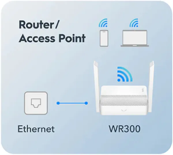 ViFi ruter sa četiri Fast Ethernet porta omogucava glatku reprodukciju video zapisa i maksimalni pristup internetu od 100 Mbps, sa Cudy Mesh i lokalnom kontrolom aplikacija. 300 Mbps Wi-Fi brzina 4× Fast Ethernet porta VPN klijent VireGuard, PPTP, L2TP Pokriva 90 m2 (950 ft2) Režimi rutera/AP/RE/VISP i mreže Verzija modela: WR300 1.0 CPU: čipset-MT7628NN; Detalji CPU-a-580 MHz Single-Core, MIPS24KEC Memorija/Stroage: Flash/ROM-8 MB (64 Mbit) NOR; DDR/RAM 64 MB (512 Mbit) DDR3 Bežični: 2,4 GHz Wi-Fi brzina-300 Mbps; 2,4 GHz Wi-Fi strimovi-2T2R (2×2 MIMO); Wi-Fi antene-2× fiksne Maksimalne performanse dometa: 100m (328 stopa); Unutarnji WiFi opseg varira u zavisnosti od rasporeda i materijala zidova. Pogledajte specifikacije performansi zida za predloge za postavljanje. Performanse zida: Dva drvena zida debljine < 3,8 cm (1,5''); Jedan betonski zid debljine < 10 cm (4'') Snaga Wi-Fi prenosa: CE: <20 dBm (2,4 GHz); FCC: <30 dBm (2,4 GHz) Interfejsi 10/100 Mbps RJ45 portovi: 4 Eternet napomene: 1× WAN port, ostalo su LAN portovi LED: sistem Fizička dugmad: WPS dugme; Reset dugme Ulaz za napajanje: DC Jack Snaga Power Methods: DC DC: 5V 1A Adapter za napajanje: Ulaz-100 ~ 240 V, 50/60 Hz AC; Izlaz-5V 1A DC Pouzdanost Okruženje: Radna temperatura: 0 C ~ 40 C (32 F ~ 104 F) Temperatura skladištenja: -40 C ~ 70 C (-40 F ~ 158 F) Vlažnost: 10% ~ 90% bez kondenzacije Vlažnost skladištenja: 5% ~ 95% bez kondenzacije Desktop za mehaničku instalaciju Dimenzije 118×80×27,5 mm 4,65×3,15×1,08 inča Težina proizvoda u EU: 120 g (4,23 oz.) Sadržaj paketa: Glavni proizvod; Adapter za napajanje; Eternet kabal; Uputstvo za instalaciju Informacije o porudžbini Težina maloprodajnog pakovanja u EU: 360 g (4,23 oz.) Maloprodajno pakovanje Dimenzije 176×140,5×56 mm; 6,93×5,53×2,2 inča Jedinice po kartonu 40 Karton Dimenzija 60×30×37,5 cm; 2,36×1,18×1,48 inča Bruto težina kartona u EU: 15,1 kg (33,29 lbs) Neto težina kartona u EU: 14,1 kg (31,09 lbs)