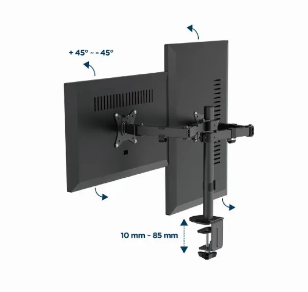 Podesiva dupla ruka monitora montirana na sto, 17”-32” Savršeno postavite ekran Lagan i nagibni dizajn - Montaža za sto za monitor sa dvostrukom rukom za monitor - Ruke omogucavaju okretanje, proširenje, uvlačenje ili naginjanje vašeg ekrana i omogucavaju rotiranje ekrana iz pejzažnog u portretni režim itd. - Radi sa skoro svim LCD monitorima (max. 32") - Odvojene ruke omogucavaju poravnato montiranje monitora različitih veličina/brendova - Snažna stezaljka za radni sto ili otvor za lako i sigurno pričvršcivanje na vaš sto - Ugrađeno upravljanje kablovima za organizovan i uredan radni prostor - VESA kompatibilan (100 x 100 mm i 75 x 75 mm) Materijal: čelik, plastika Površinska obrada: praškasti premaz Boja: Crna Podržana veličina ekrana: 17" - 32" Kapacitet težine: 9 kg (po displeju) VESA nosač: 75 x 75, 100 x 100 mm Opseg nagiba: +45 ° ~ -45 ° Opseg okretanja: +90 ° ~ -90 ° Rotacija ekrana: +180 ° ~ -180 ° Instalacija: Stezaljka za sto ili otvor Maks. Debljina stola: Stezaljka: 10 ~ 85 mm, Uložak: 10 ~ 40 mm Upravljanje kablovima: da Neto težina: 3,5 kg
