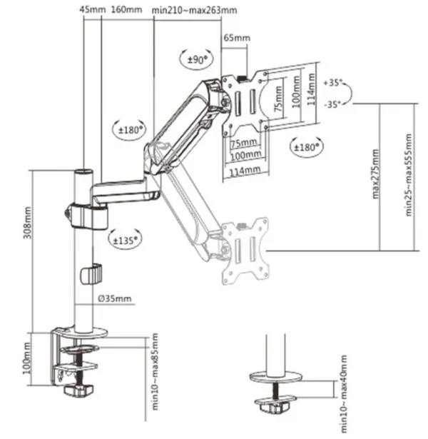 Postavite ekran savršeno Montaža za sto za monitor sa jednom rukom za monitor -Ruka se rotira, izvlaci i uvlaci, naginje da promeni uglove citanja i omogucava rotaciju ekrana iz pejzažnog u portret režim itd. -Omogucava lako ergonomsko pozicioniranje za smanjeno opterecenje -Radi sa skoro svim LCD monitorima (max. 32") -Izdržljiva podesiva gasna opruga pogodna za monitore od 1 - 9 kg -Ugradeno upravljanje kablovima za organizovan i uredan radni prostor -Snažna stezaljka za radni sto ili otvor za lako i sigurno pricvršcivanje na vaš sto -Odvojiva VESA ploca omogucava jednostavnu instalaciju -VESA kompatibilan (100x100mm i 75x75mm) Materijal: celik, plastika, aluminijum Površinska obrada: praškasti premaz Boja: crna fine teksture Odgovara velicini ekrana: 17" - 32" Kapacitet težine (po ekranu): 1 ~ 9 kg Vesa kompatibilan: 100x100, 75x75 mm Opseg nagiba: +35° ~ -35° Opseg okretanja: +90° ~ -90° Rotacija ekrana: +180° ~ -180° Montaža: spojnica, stezaljka Preporucena debljina radne površine: stezaljka: 10 ~ 85 mm, otvor: 10 ~ 40 mm Upravljanje kablovima: da Neto težina: 3,3 kg