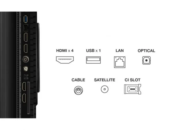 | Priključci / Slotovi | HDMI 2.1 priključak: 4 USB 2.0 priključak: 1 RF ulaz CI Slot Digitalni optički audio izlaz LAN priključak Bežična veza: Wi-Fi 5 Bluetooth 5.4 |